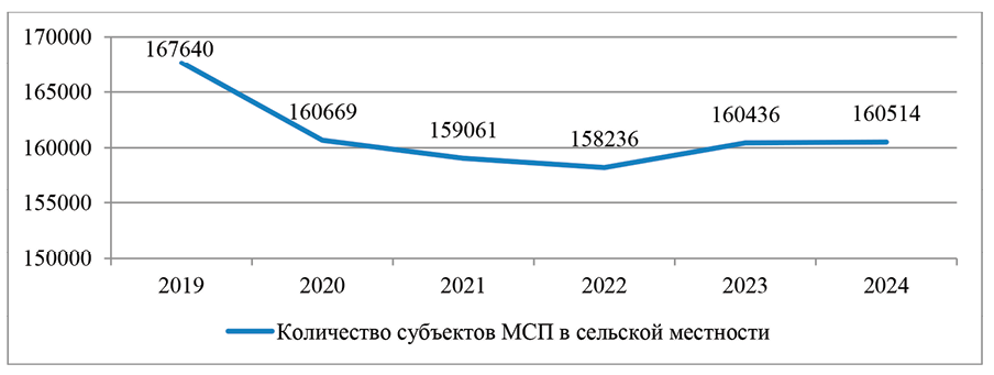 На основе собранных статистических и аналитических данных была зафиксирована устойчивая тенденция снижения предпринимательской активности в сельских районах России. По данным Федеральной налоговой службы с 2019 года по 2024 год доля субъектов МСП в сельской местности в общем количестве субъектов МСП сократилось с 2,8 % до 2,4 %. Общее количество субъектов МСП в сельской местности за 6 лет сократилось на 5 % (рисунок).