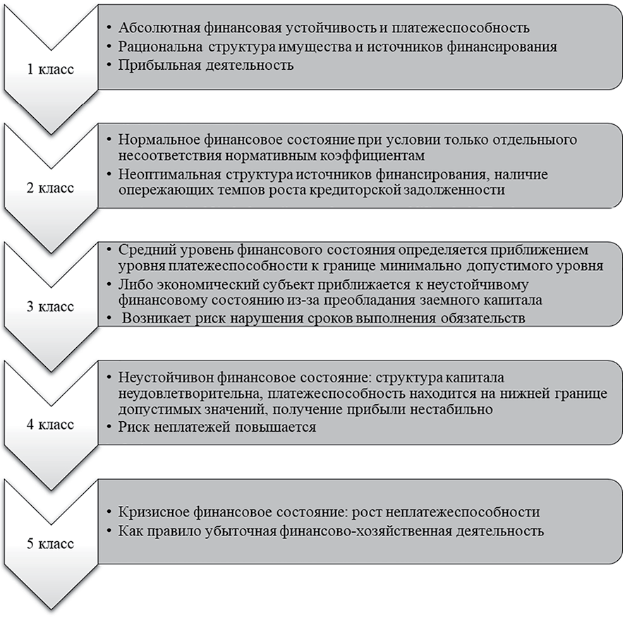 На основе расчета системы показателей (рис. 1) авторами предлагается методика отнесения экономического субъекта к одному из классов финансового состояния, адаптированная из работы [8] (рис. 4). Данная классификация служит основой для разработки корректирующих мер.