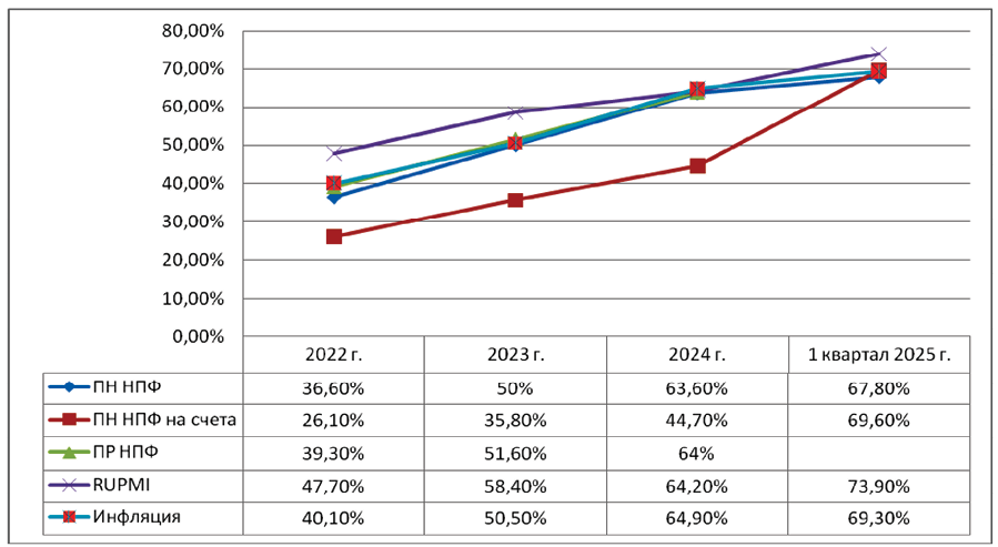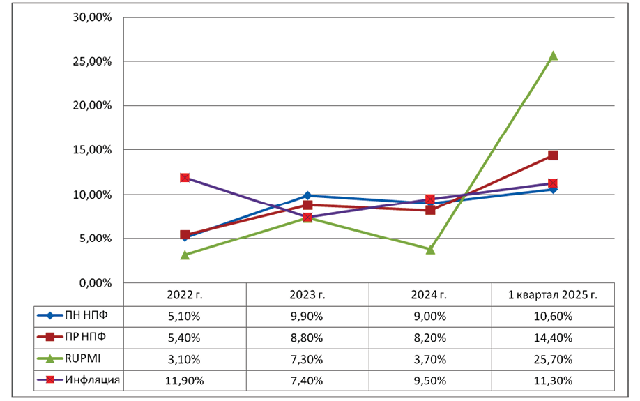 Рис. 1. Показатели накопленной доходности НПФ с 2022 г. по I квартал 2025 г. со сравнительными показателями инфляции и сбалансированного индекса пенсионных накоплений, % [21]