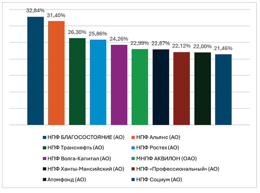 Рисунок 3 показывает топ 10 НПФ по доходности пенсионных накоплений по статистике на 2 квартал 2025 года, на первом месте находится НПФ Благосостояние (АО) с доходностью 32,84%, на последнем месте в данном рейтинге НПФ Социум с доходом 21,46%, разница между первым и последним местом составляет более 11%.