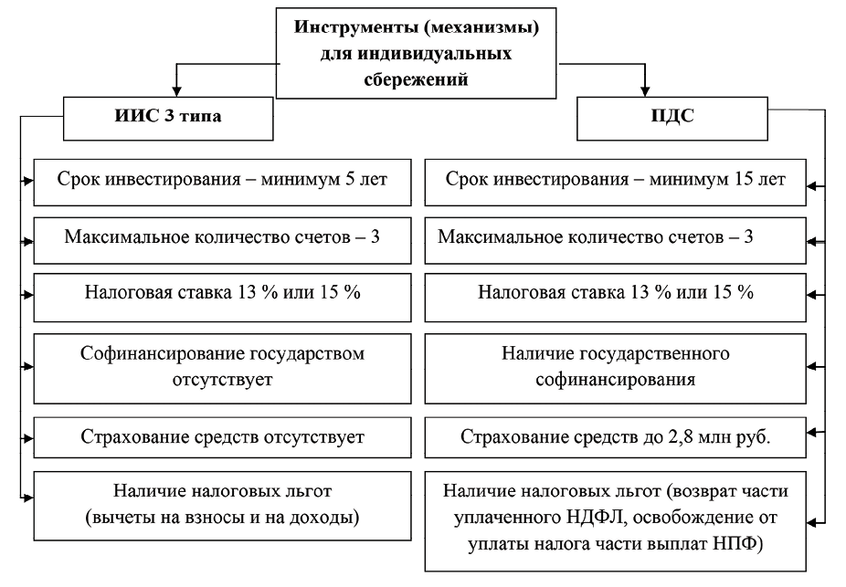 И при ПДС и при ИИС 3-его типа закон предусматривает возможность налогового вычета в размере 13 или 15 % от суммы взносов (до 400 тыс.руб.). Несмотря на некоторую схожесть в отношении налоговых льгот, инвестирование посредством ИИС является более рискованным, поскольку ПДС гарантирует участие государства и страхование денежных средств, а в ИИС такая опция отсутствует [1, с. 29].