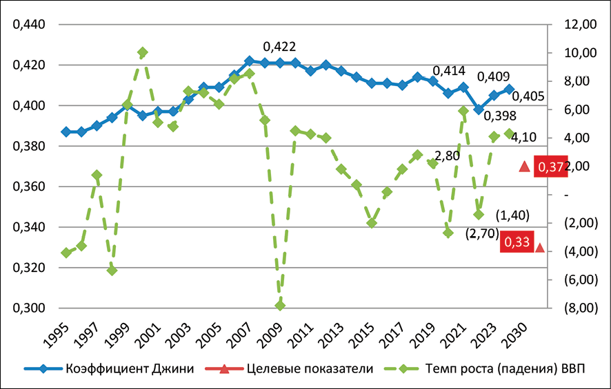 В составе целевых показателей достижения приоритетной цели «Сохранение населения, укрепление здоровья и повышения благополучия людей, поддержка семей», определенных в составе национальных целей Указом Президента Российской Федерации от 07.05.2024 № 309 «О национальных целях развития Российской Федерации на период до 2030 года и на перспективу до 2036 года» определено снижение коэффициента Джини до 0,37 к 2030 г. и до 0,33 к 2036 г. Целевой уровень показателя ниже, чем его значения за последние 30 лет (рис. 1).