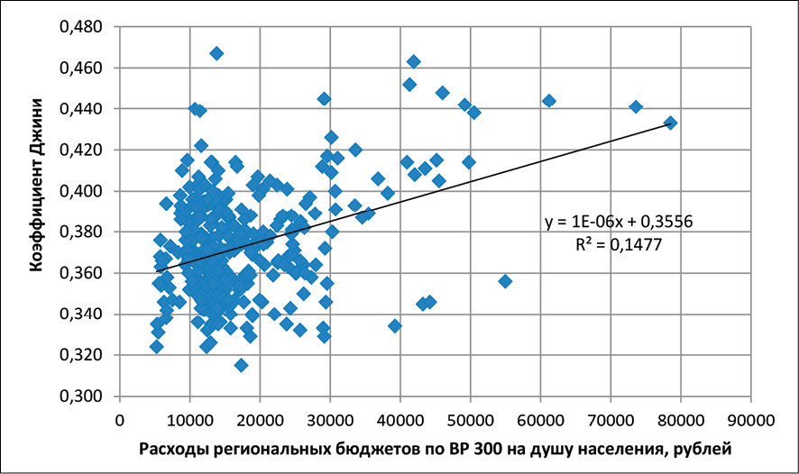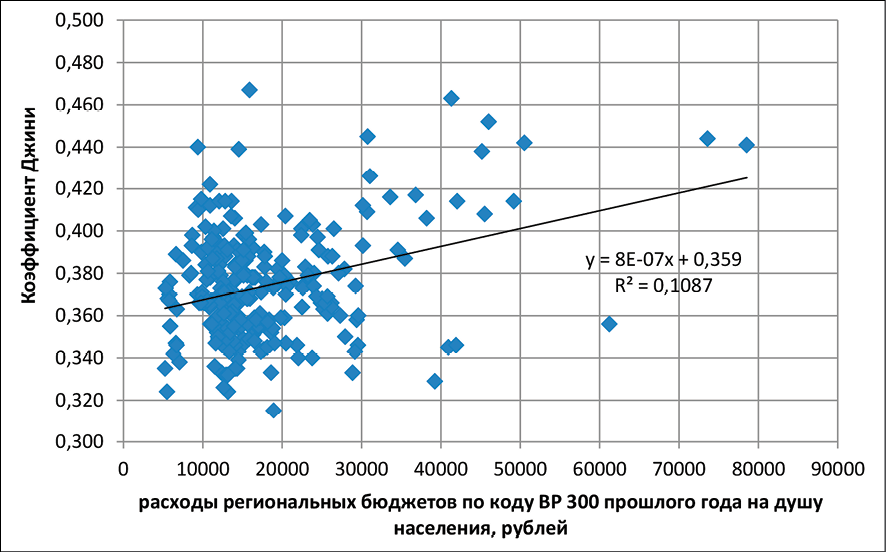 Графический анализ (рисунок 2) показывает слабую зависимость между коэффициентами Джини и расходами региональных бюджетов по группе видов расходов 300 на душу населения в субъектах Российской Федерации, и скорее обратный эффект – более высокий уровень социальных выплат приводит к большему расслоению. При этом коэффициент корреляции составляет 0,384.
