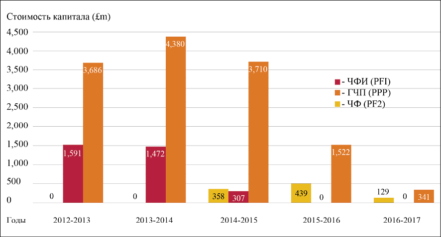 Стоимость капитала заключенных проектов ЧФИ и ЧФ2 (£m) |