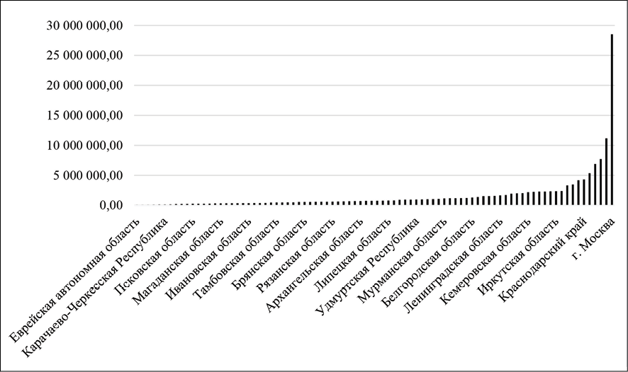 Сравнительный анализ уровня социально-экономического развития регионов России осуществлён с опорой на показатель валового регионального продукта (ВРП), представленный на рисунке 1. Этот индикатор позволяет, с одной стороны, в стоимостном выражении отразить совокупные результаты функционирования предприятий и учреждений, а с другой – точно определить эти итоги в пределах конкретного субъекта Федерации.