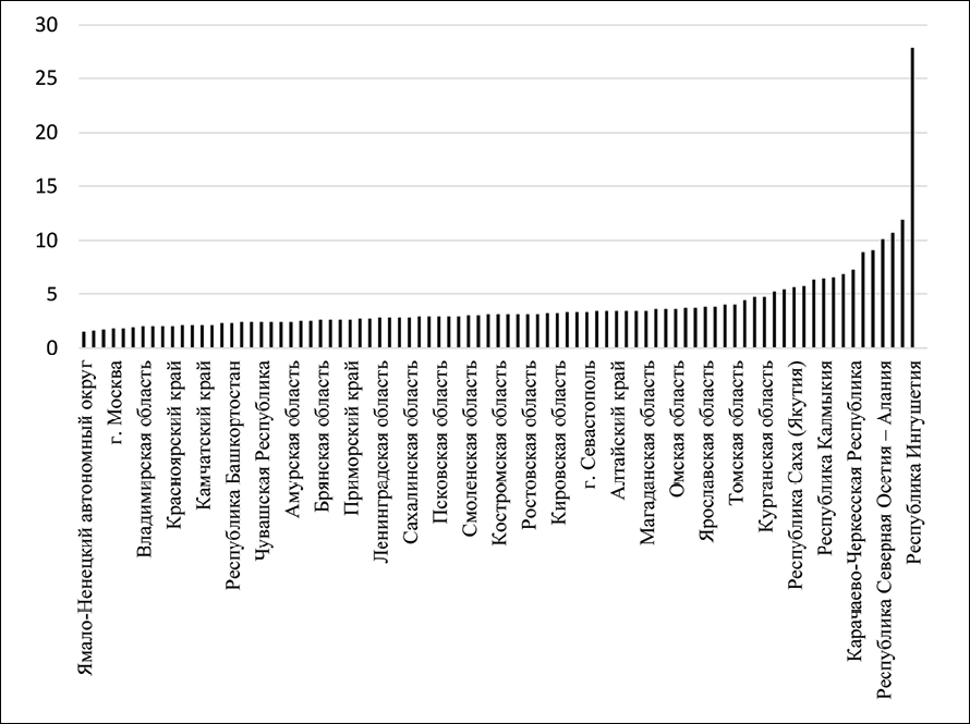 Различия в уровне среднедушевых доходов подтверждают устойчивое социально-экономическое неравенство между регионами Российской Федерации [2]. Темпы роста доходов демонстрируют неоднородность экономического развития страны: в одних субъектах наблюдается уверенное укрепление доходной базы населения, тогда как в других рост ограничен, а уровень жизни остаётся низким [3]. Это означает, что в ближайшей перспективе необходима активизация механизмов регионального выравнивания, в том числе за счёт перераспределения ресурсов, стимулирования инвестиций в депрессивные территории и поддержки занятости.