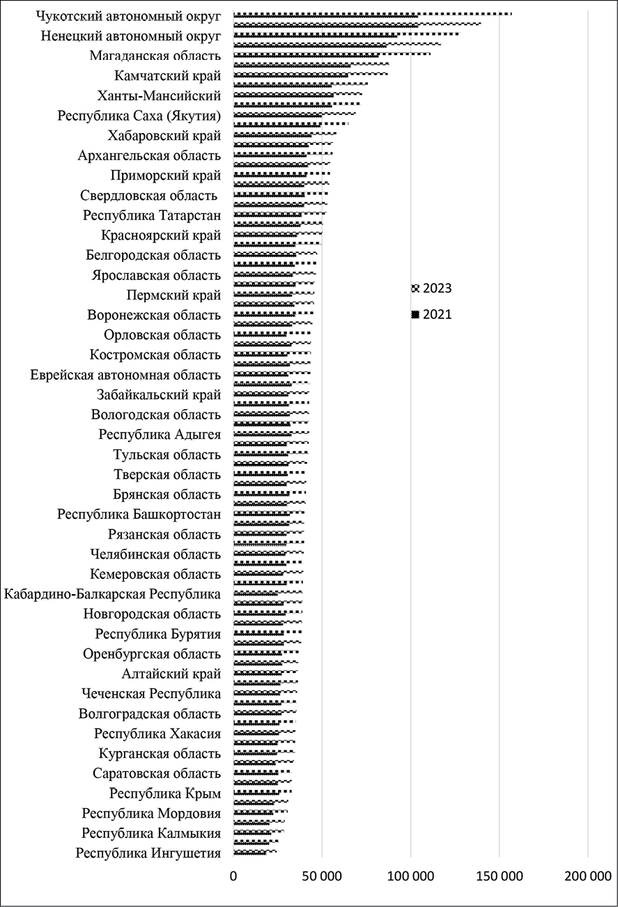 Среднедушевой доход показывает средний уровень дохода на одного члена семьи. Среднедушевой доход населения в России в период с 2021 по 2023 год увеличился в среднем на 24 %, что эквивалентно приросту примерно на 8300 рублей (рис. 3). Этот рост отражает общее повышение уровня доходов граждан, что, с одной стороны, связано с инфляционными процессами, а с другой – с адаптацией экономики к постковидному восстановлению и реализацией ряда государственных мер поддержки.
