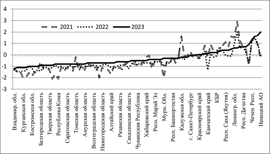 Рис. 4. Естественный прирост (убыль) населения в регионах России в 2021-2023 гг., % к предыдущему году Примечание: составлено автором на основе данных Федеральной службы государственной статистики