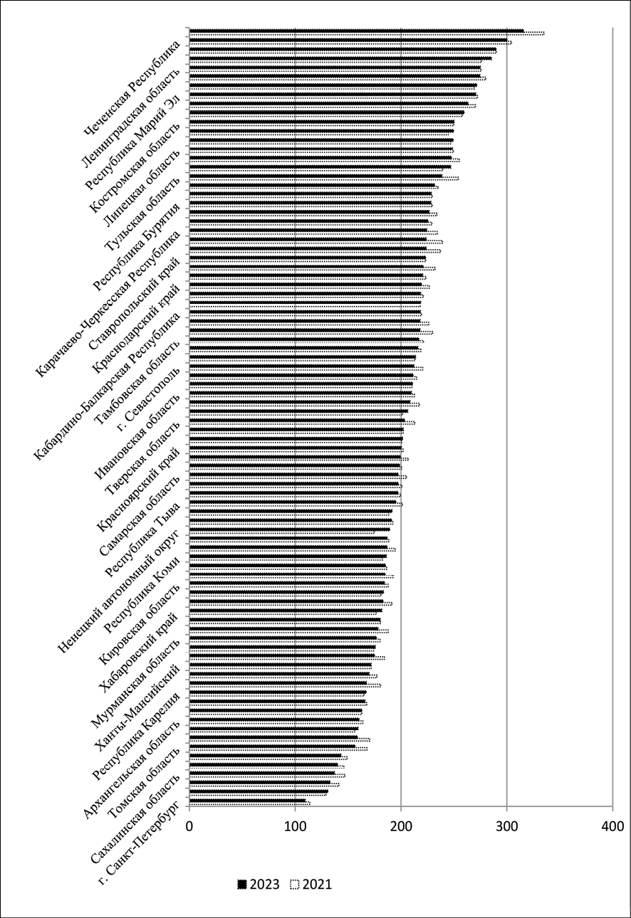 К примеру, обеспеченность врачами для различных регионов Российской Федерации различна. Самые высокие значения показателя обеспеченности врачами в 2023 году зафиксированы в г. Санкт-Петербург, в Чукотской автономной области и в г. Москве – на 1 врача приходится 109,4, 130,9, 132,9 пациентов соответственно. Самая большая нагрузка на врачей в Псковской области, Чеченской Республике и Курганской области: здесь на 1 врача приходится 289,8, 300,1, 315,7 пациентов соответственно (рис. 5).
