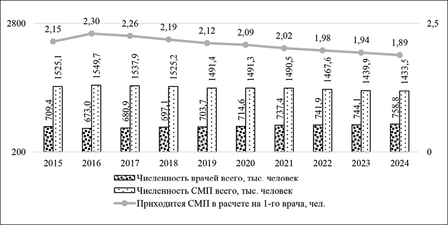 Рис. 1. Динамика численности врачей и СМП в системе здравоохранения России в 2015-2024 гг. Источник: составлено автором по данным [14]
