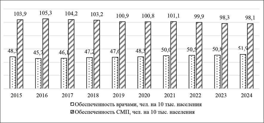 Рис. 2. Динамика обеспеченности врачами и СМП в системе здравоохранения России в 2015-2024 гг. Источник: составлено автором по данным [14]