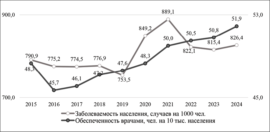 Сопоставление основных трендов уровня заболеваемости населения и уровня обеспеченности врачами в исследуемом периоде показало, что даже в условиях постоянного повышения числа врачей в расчете на 10 тыс. населения страны заболеваемость изменяется волнообразно, существенно снижаясь к 2019 году – до 753 случаев на 1000 населения, а в 2020-2021 гг. достигла максимума – 849-889 случае на 1000 населения. В 2023-2024 гг. произошло снижение уровня заболеваемости населения, а обеспеченность врачами продолжила расти. Несмотря на это, заболеваемость населения даже в условиях относительно высокого уровня обеспеченности врачами существенно выше, чем в доковидный период, когда на 10 тыс. населения приходилось только 45-47 врачей.
