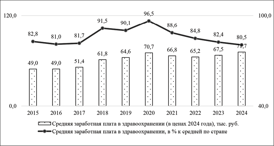 Динамика уровня оплаты труда в отрасли в сопоставимых ценах показывает, что с 2018 году темпы роста средней заработной платы замедлились. Если в 2015-2017 гг. показатель составлял едва ли больше 50 тыс. рублей, то в 2018 году превысил 61,8 тыс. рублей. В 2020 году был достигнут максимум средней заработной платы – 70,7 тыс. рублей, что связано с началом пандемии и усилением поддержки медицинского персонала в непростых эпидемиологических условиях. Однако период 2021-2023 гг. вследствие высоких темпов инфляции характеризуется снижением реального уровня средней заработной платы в здравоохранении, где минимум был достигнут в 2022 году – 65,2 тыс. рублей. Лишь только к 2024 году произошло повышение реального уровня оплаты труда в отрасли – 71,7 тыс. рублей.