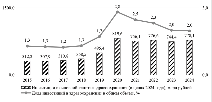 Однако в 2021-2024 гг. произошло снижение реального объема инвестиций в основной капитал здравоохранения до менее чем 800 млрд рублей ежегодно. Удельный вес инвестиций в отрасль в общем объеме начиная с 2020 года качественно вырос: если прежде показатель составлял около 1,3-1,7%, то в период пандемии был увеличен до 2,8%. В последние 4 года удельный вес инвестиций в отрасль стал вновь снижаться и достиг 2%.