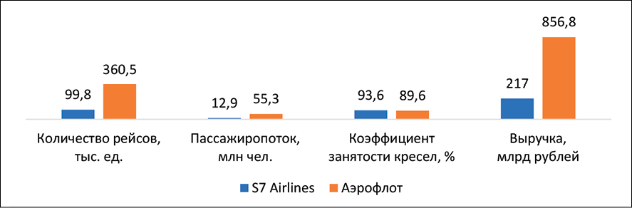 Сравнение итогов функционирования авиакомпаний доказывает, что все показатели деятельности «Аэрофлота», за исключением коэффициента занятости кресел, в 3,5-4,5 раза превышают аналогичные показатели «S7 Airlines». Однако коэффициент занятости кресел выше у S7, что говорит о способности авиакомпании перевезти большее количество пассажиров меньшим количеством рейсов, нанося меньший вред окружающей среде.