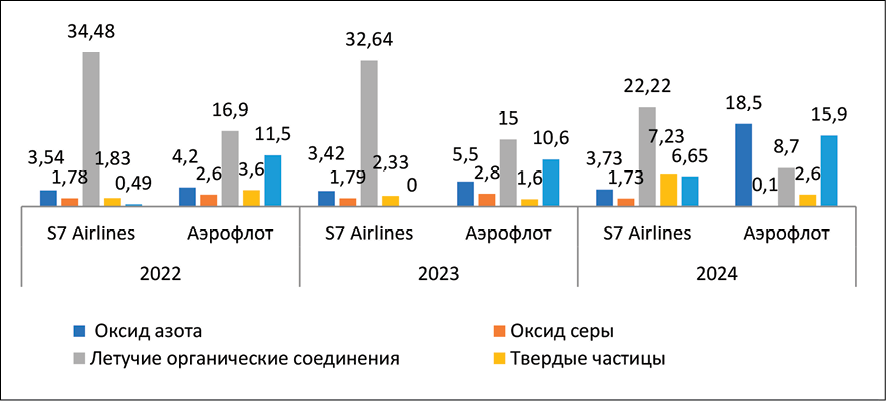 Анализ динамики выбросов «S7 Airlines» показывает, что общее количество выбросов вредных веществ осталось неизменным. Однако отдельные показатели значительно увеличились. Так, выбросы других загрязняющих веществ показали рост в 13,6 раза, а концентрация твердых частиц – в 4 раза. Однако, уровень летучих органических соединений снизился до 60% от исходного показателя. Аналогичная ситуация у авиакомпании «Аэрофлот», у которой незначительно увеличились выбросы других загрязняющих веществ и оксида азота в 4,4 и 1,38 раз, соответственно. В целом же «S7 Airlines» выбросы в атмосферу значимых загрязняющих веществ незначительно сократила, в то время как «Аэрофлот», наоборот нарастил в 1,2 раза. Таким образом, анализ выбросов в атмосферу значимых загрязняющих веществ авиакомпаний демонстрирует существенное преимущество «S7 Airlines», объем выбросов которой в 1,5 раза меньше выбросов группы конкурентов.
