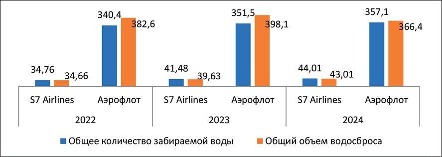 Анализируя представленные данные о водопотреблении и водосбросе авиакомпаний «S7 Airlines» и «Аэрофлот» за 2022-2024 годы, можно констатировать устойчивый рост водопотребления и водосброса у первой авиакомпании, 27 % и 5 % соответственно. «Аэрофлот» незначительно увеличил потребление воды на 4,9 %, и снизил водосброс на 4,2 %. Таким образом, можно сделать вывод о более эффективном использовании воды «S7 Airlines», чем ее конкурентом. Если разница между водопотреблением и водосбросом у «S7 Airlines» составляет 2,5 тыс. м3, то у «Аэрофлота» – 9,1 тыс. м3.