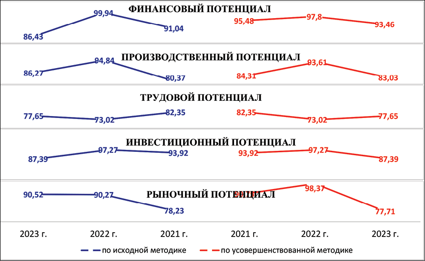 Переход от использования нормативных значений к среднеотраслевым показателям привёл к кардинальному пересмотру динамики потенциала. Если в рамках первоначальной методики (нормативы) наивысший потенциал был зафиксирован в 2022 г. с последующим значительным спадом в 2023 году на 27,08 п.п., то применение среднеотраслевой базы не только изменило абсолютные значения баллов, но и усугубило оценку спада в 2023 г. (снижение на 9,02 балла против предыдущей методики). Это указывает на то, что отраслевые нормативы рентабельности и ликвидности в 2023 г. оказались существенно жёстче общих нормативных требований, что и отразилось в снижении итогового балла. Наибольший вклад в данное изменение внесли показатели финансового, производственного и рыночного субпотенциалов, что свидетельствует о высокой чувствительности именно этих компонентов к конъюнктуре отрасли.
