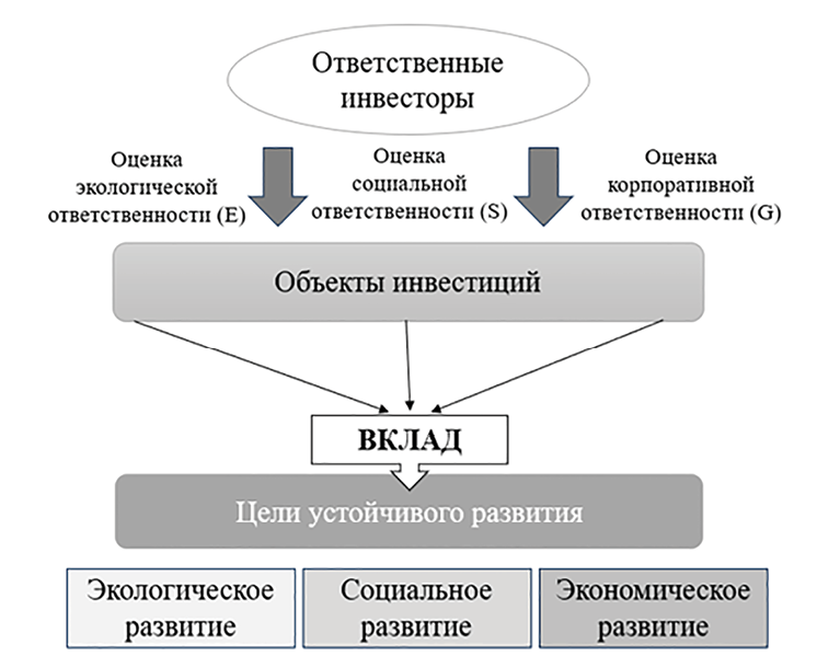 Рис. 2. Взаимосвязь ответственного инвестирования с ESG-факторами и целями устойчивого развития Источник: составлено авторами