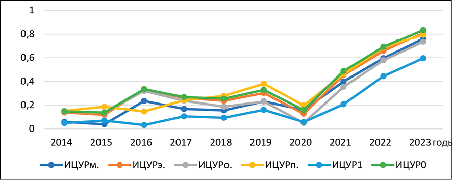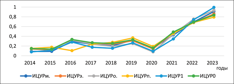 Приведение различных социально-экономических показателей к общей шкале было осуществлено с помощью методов нормализации. В результате расчета индекса было установлена положительная динамика изменения индекса ценностной устойчивости региона. В соответствии с рисунком 1 за исследуемый период с 2014 года по 2023 год индекс (ИЦУР0 ) увеличился в 5,7 раза. Следует отметить, что, начиная с 2014 года были приняты основные федеральные законы, регламентирующие государственную политику в сфере сохранению традиционных российских духовно-нравственных ценностей. Анализ чувствительности изменения весовых значений на 25% показал значительный рост индекса в 10,3 раз в случае повышения весового коэффициента по числу посещений историко-культурных памятников.