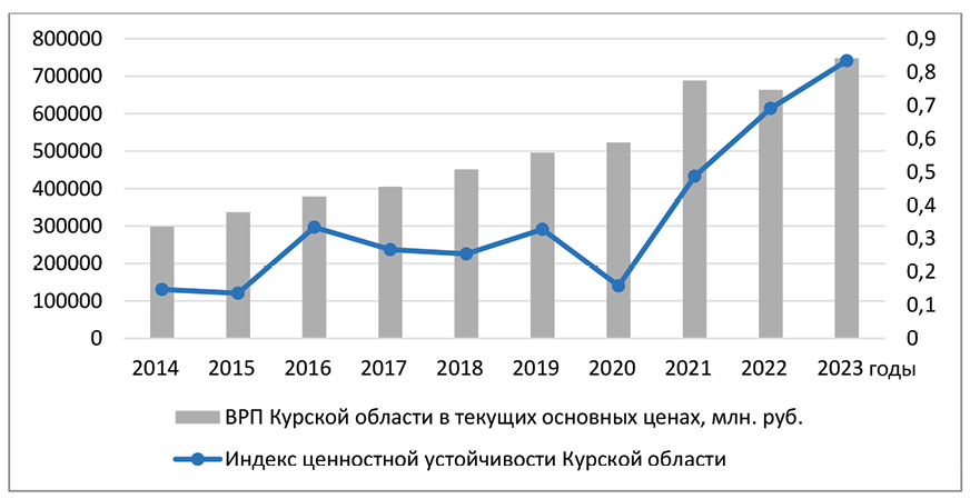 Рис. 3. Динамика ВРП и индекса ценностной устойчивости Курской области Источник: составлено автором