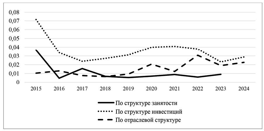 Как показывают расчеты, значение индекса Рябцева по стру ктуре добавленной стоимости видов экономической деятельности за период 2015–2024 гг. изменяется в пределах от 0,0065 (2018 г.) до 0,0307 (2022 г.). Это свидетельствует о весьма низких уровнях различия стру ктур и даже их тождественности (таблица 2).