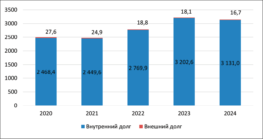 Рис. 1. Динамика и структура государственного долга субъектов Российской Федерации за 2020-2024 гг., млрд руб. Источник: составлено автором на основании данных [4]