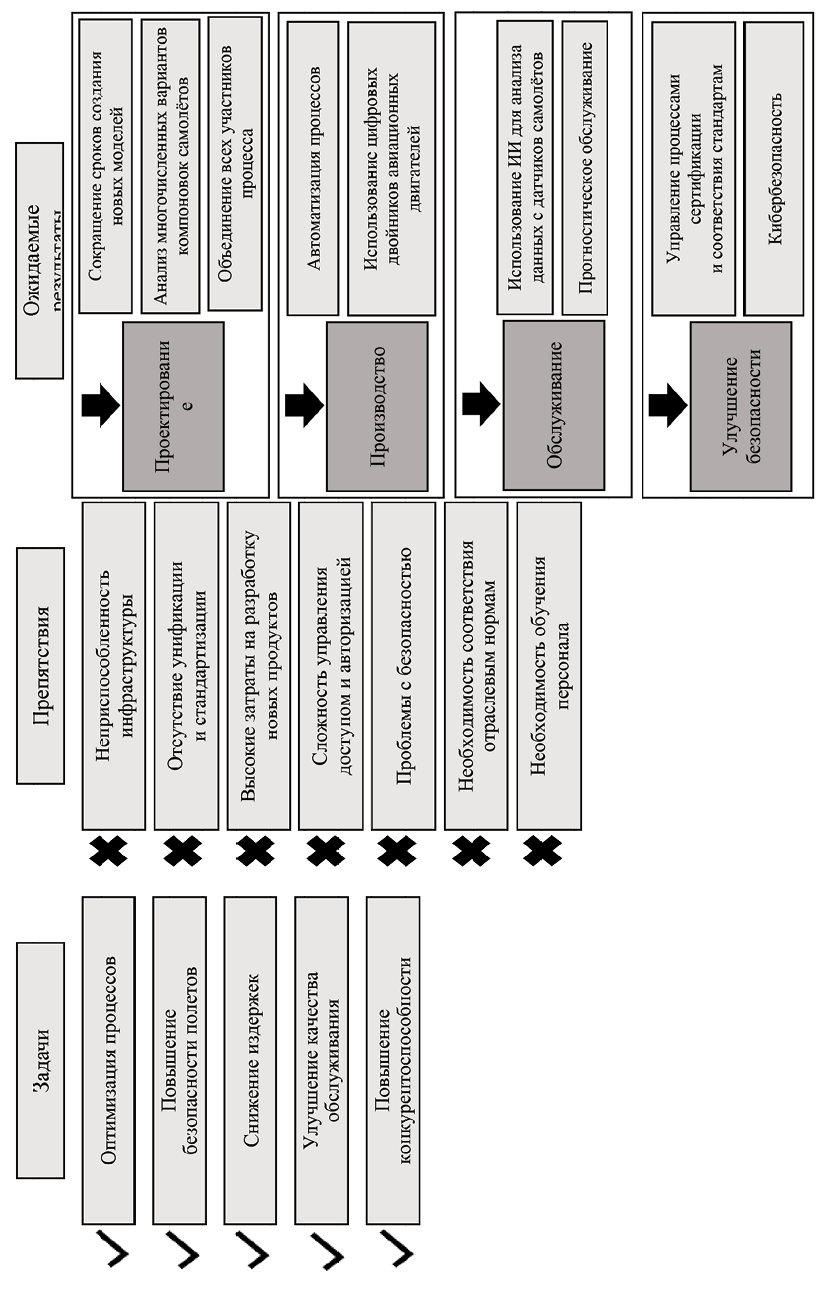 Авиационная отрасль играет значительную роль в развитии национальной экономики и занимает приоритетную позицию в рамках государственных задач. Активное развитие новейших технологий является локомотивом для формирования высоких достижений на мировом рынке. Цифровая трансформация определяет современные перспективные направления применения передовых подходов к обеспечению высокой конкурентоспособности отечественной промышленности. В стратегии развития авиационной отрасли вопросам цифровизации уделяется большое внимание в связи с растущими потребностями рынка и необходимостью выхода на передовые позиции среди мировых лидеров [1]. Производственные процессы в авиастроении насыщены информационными потоками и особенно сложны. Однако, конкурентная среда, сформировавшаяся за последние годы в отрасли, предъявляет высокие требования в части ускоренного запуска новых изделий, оперативного введения конструкторских изменений, также актуальны вопросы импортозамещения авиационной продукции. Данные условия предопределяют автоматизацию процессов конструирования и производства, необходимость быстрого принятия эффективных управленческих решений, целесообразность гибкого реагирования на изменения рынка, организацию работы в ограниченной информационной среде. В связи с этим, особую актуальность приобретают широкое использование математических методов, компьютерной техники, моделирования и информационных технологий. Высокотехнологичная продукция требует активного применения цифровых инструментов для построения и анализа процессов деятельности. Информатизация и автоматизация технологических процессов, применение искусственного интеллекта, новации в области электродвижения и развитие беспилотной авиации являются базой для успешного завоевания лидерских позиций. Вопросы перспектив развития информатизации были рассмотрены на заседании Экспертного совета Комитета авиационной промышленности, где определили потребность по формулированию рекомендаций и предложений в области законодательной инициативы и нормативной базы. Важным направлением остается реализация проектов по импортозамещению программных продуктов проектирования авиационной техники и управления бизнес-процессами. Кроме того, кадровый вопрос остается немаловажным, для решения комплексных задач, стоящих перед авиапромышленностью, необходимы высококвалифицированные специалисты в области информационных технологий. Аналогичные задачи обсуждались на первой всероссийской конференции «АвиаЦифра 2025» в Казани, что подтверждает актуальность исследуемой темы [2].