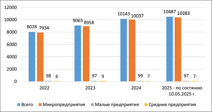 Рис. 1. Количество МСП Республики Тыва за 2022-2025 гг. [13] Источник: составлен авторами на основе данных Единого реестра субъектов малого и среднего предпринимательства ФНС России
