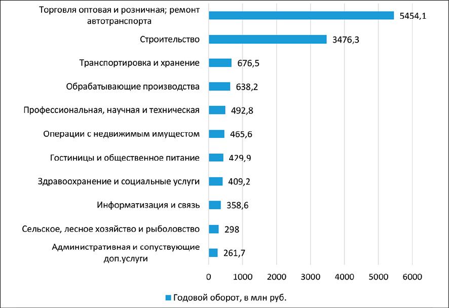 На рисунке 2 представлены основные отрасли, где у малых предприятий республики больше оборота в млн руб. за 2023 г. [15]