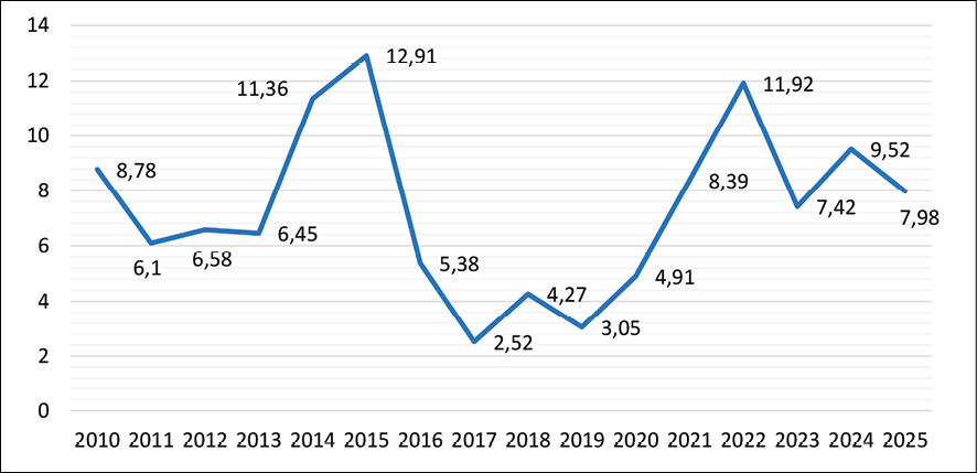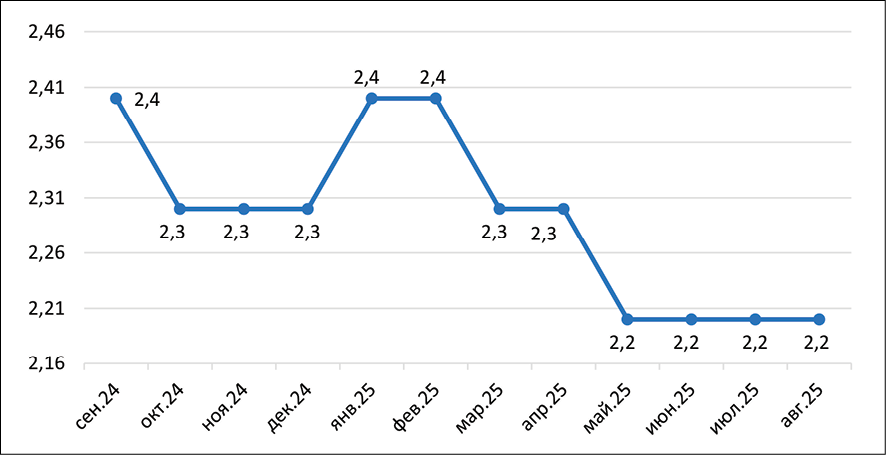 Рис. 1. Инфляция в России за 2010-2025 г.г. % Источник: Инфляция и ключевая ставка Банка России. URL: https://cbr.ru/hd_base/infl/ (дата обращения: 25.09.2025)