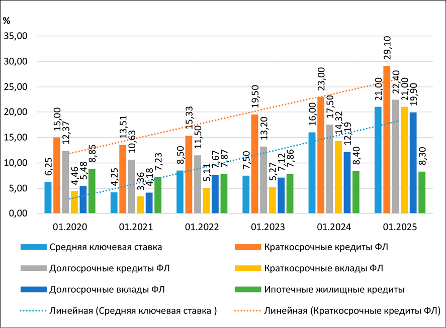 Цель исследования. Рассмотрим в этой связи влияние денежно-кредитной политики на благосостояние населения, определяемое доходами и направлениями их использования. В условиях сложившейся ситуации Банк России был вынужден значительно увеличить ключевую ставку, являющуюся основным инструментом денежно-кредитного регулирования, максимальное значение которой составляло 21 % на период с 28.10.2024 до 09.06.2025 гг. [2] Это вызвало увеличение ставок по краткосрочным кредитам физических лиц с 15,33% в январе 2022 г. до 29,1% в январе 2025 г. (максимальная ставка краткосрочного кредитования физических лиц наблюдалась в декабре 2024 г.), по долгосрочным кредитам – с 11,5% до 22,4%, в том числе по долгосрочным автокредитам – с 14,36% до 22,1%. Средние месячные ставки по краткосрочным вкладам физических лиц увеличились с 5,11% в январе 2022 г. до 21,0% в 2025 г., по долгосрочным – с 11,5% до 19,9% (рис. 1).