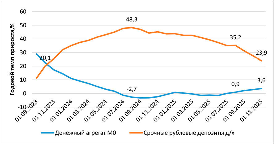 Годовой темп прироста срочных депозитов домашних хозяйств достиг максимума и составил 48,3%. Затем наблюдается снижение темпов роста объема срочных депозитов и на 1.11.2025 г. годовой темп прироста достиг 23,9%. В то же время снижение объема наличных денег в обращении перешло в незначительный рост. Этому способствовало снижение ключевой ставки, усиление недоверия и возрастание рисков заморозки вкладов из-за нестабильности экономики и финансовой системы, повышение цен на потребительские товары и услуги.