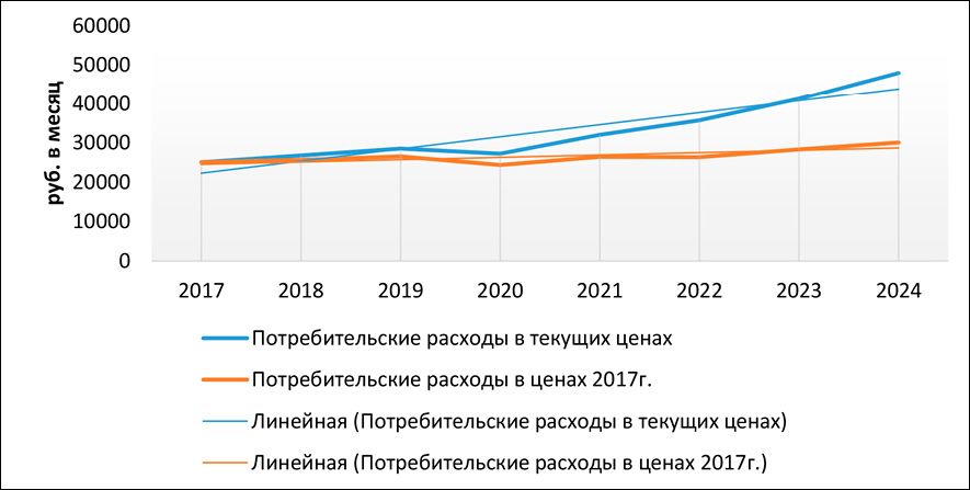 Объем потребительских расходов на душу населения в месяц увеличился за три года на 49,7%. На объем потребительских расходов оказывает влияние изменение их в количественном выражении и за счет изменения цен, поэтому целесообразно исключить влияние цен, скорректировав его на индекс потребительских цен. Если рассмотреть изменение потребительских расходов в постоянных ценах 2017 г., то есть в натуральном выражении, то в 2022 г. наблюдалось незначительное снижение потребительских расходов, в 2023 г.– рост на 7,4%, в 2024 г. – рост на 6,4% (таб. 2, рис. 3). При этом наблюдается отставание роста потребления от роста реальных денежных доходов населения. В целом за семь лет потребительские расходы на душу населения в постоянных ценах увеличились на 19,9%, а денежные доходы в реальном выражении – на 24,3% (табл. 2).