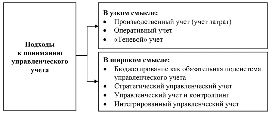На рисунке представлены подходы к пониманию управленческого учета в России, объединенные по принципу «узкого» и «широкого» взгляда на его суть.