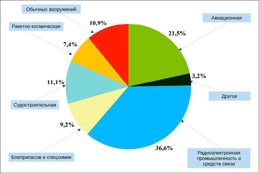 Наибольшую долю в составе отраслей ОПК Российской Федерации занимают предприятия радиоэлектронной промышленности и средств связи, занимающие 36,6% от общего количества предприятий, и авиационная промышленность, занимающая 21,5%. Несмотря на лидирующее положение этих двух отраслей, в последние годы значимость других видов деятельности в составе ОПК также возрастает. Так, например, ракетно-космическая промышленность в текущий период составляет наименьшую долю, но эта отрасль становится в последние годы все более важным базовым элементом отечественного оборонного потенциала, отличается наукоёмкостью производственных процессов и высокотехнологичностью выпускаемых изделий. Ракетостроение несёт в себе высокий инновационный потенциал, который может оказывать значительное влияние не только на оборонные возможности страны [22], но также и на решение многих государственных задач в других сферах – экономической, социальной и др.