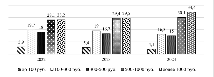Рис. 2. Динамика структуры продаж на фармацевтическом рынке в России по уровню стоимости за упаковку в 2022-2024 гг., %