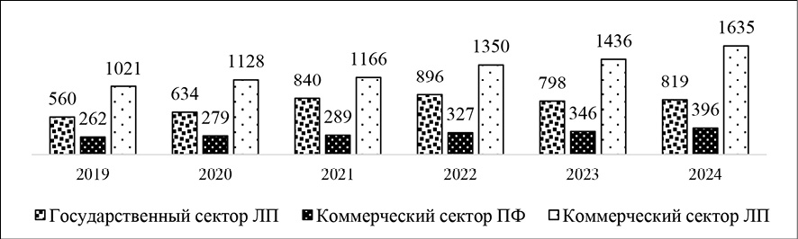 Вторым по величине является государственный сектор, доля которого составляет около одной трети: в период 2021-2022 гг. удельный вес государственного сегмента вырос до 36,6%, что обусловлено ростом госзакупок фармацевтической продукции в период пандемии. Однако в 2023-2024 гг. доля государственного сектора ЛП снизилась до менее чем 29%. Объем продаж в коммерческом сегменте парафармацевтики является наименьшим в общей структуре и не превышает даже 15%. В динамике доля данного сегмента снижалась в период пандемии, что также обусловлено изменением структуры спроса в сложившихся эпидемиологических условиях (рисунок 3).