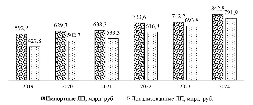 В исследованиях предыдущих лет [17] уже подчеркивалось, что локализация является первым шагом на пути повышения лекарственной безопасности страны, поскольку снижает зависимость фармацевтического рынка от внешней конъюнктуры. Но при этом, по мнению пациентов и медицинского сообщества [18], внутренний потенциал фармацевтического производства пока еще не соответствует потребностям рынка, поскольку отечественные аналоги уступают по качественным характеристикам импортной продукции.
