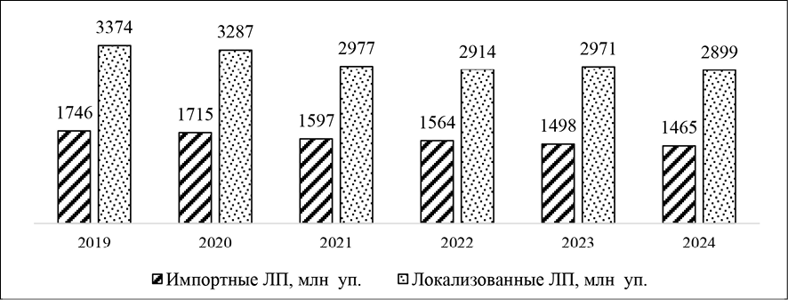 Доля локально произведенных ЛП в общей структуре проданных на рынке упаковок превышает 65% и показывает динамику роста к концу рассматриваемого периода. Но при этом в количестве проданных единиц также сохраняется тенденция к снижению: если в 2019 году реализовали 3374 млн упаковок локально произведенных ЛП, то уже с 2021 года показатель составил менее 3 млрд упаковок. В 2024 году было продано 2,9 млрд упаковок локальной продукции.