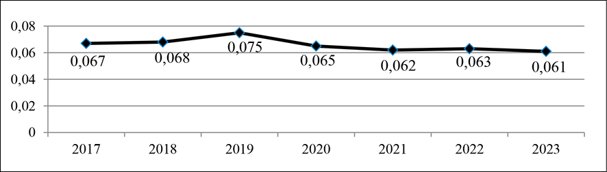 Рис. 2. Динамика объемов государственной финансовой поддержки сельского хозяйства в РФ в расчете на 1 рубль сельскохозяйственной продукции за 2017-2023 гг., ед. Примечание: рассчитано автором на основании [8]