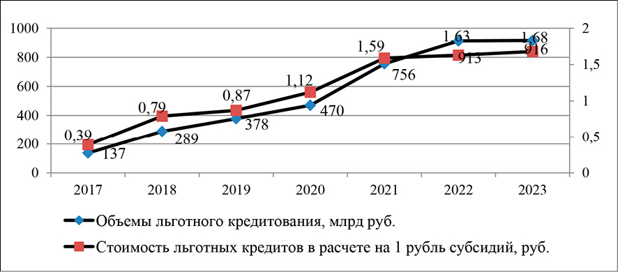 Несмотря на положительные изменения в сфере государственного регулирования развития сельского хозяйства, существуют тенденции снижения качества государственной поддержки отрасли, что подтверждается динамикой исследуемого показателя (объемов финансирования) в расчете на 1 рубль стоимости произведенной сельскохозяйственной продукции (рис. 2). На протяжении 2017-2023 гг. исследуемый показатель варьировал в пределах 0,061-0,075 ед., достигнув максимального значения в 2019 г. (0,075 ед.), что объясняется необходимостью повышения уровня обеспечения продуктами питания населения в период пандемии. В последующем показатель снизился за счет роста объемов производства сельскохозяйственной продукции (на 67%) на фоне снижения размеров бюджетного финансирования отрасли в 2023 г. и составил 0,061 ед., что на 0,014 ед. меньше показателя 2019 г. действующих механизмов государственной поддержки и повышения финансово-экономической самодостаточности сельскохозяйственных предприятий является льготное кредитование, в рамках которого предусмотрено субсидирование процентных ставок по кредитам (в т. ч. инвестиционным) и установление приоритетных направлений их использования. Начиная с 2017 г. в рамках реализации Программы льготного кредитования сельскохозяйственных товаропроизводителей ставка по кредитам составляла до 5%, при которой объемы кредитования предприятий составили 137 млрд руб. (рис. 3). В связи с инфляционными процессами, ростом себестоимости сельскохозяйственного производства и потребностью в инвестиционном развитии предприятий объемы льготного кредитования в 2023 г. достигли 916 млрд руб., что более чем в 6 раз больше уровня 2017 г.