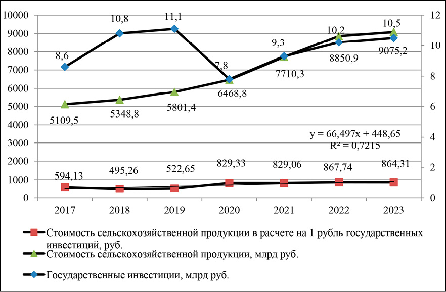 Одним из направлений государственной финансовой поддержки сельского хозяйства выступает инвестирование за счет государственного бюджета. По данным Государственного комитета статистики Российской Федерации процессы инвестирования в сельскохозяйственное производство в течение 2017-2023 гг. значительно активизировались, о чем свидетельствует рост инвестиционных вложений на 48,21%, суммы которых достигли 584,37 млрд руб. Однако в 2023 г. темп роста объемов инвестирования значительно сократился по сравнению с 2022 г. и составил 3,3%, что объясняется общей экономической обстановкой в государстве в условиях геополитической нестабильности. При этом тенденции государственных инвестиций на протяжении 2017-2023 гг. характеризуются ростом, при котором суммы вложений в 2023 г. возросли на 22,1% по сравнению с 2017 г. и на 34,6% по сравнению с 2020 г. Наибольший инвестиционные вложения за счет бюджетных средств были реализованы в 2019 г. в соответствии с мерами государственной политики, направленной на активизацию развития сельскохозяйственного производства и импортозамещение в периоды пандемии и геополитической нестабильности развития экономики.