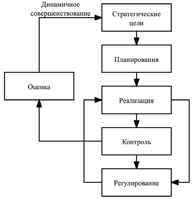 Система энергетического менеджмента охватывает весь процесс потребления, передачи и использования энергетических ресурсов. Она предполагает разработку энергетической политики, внедрение принципов непрерывного совершенствования и координацию задач соответствующих подразделений. В рамках системы осуществляется планирование энергоменеджмента, проведение энергоаудита, установление энергетических базисов и показателей, а также разработка конкретных программ управления энергоресурсами. На этой основе обеспечиваются последующие процессы контроля, мониторинга, анализа и оценки в сфере энергоменеджмента (рис. 1).