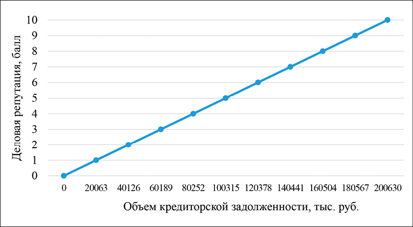 В 2024 году сумма предоставленных товарных кредитов составляла 160820 тыс. руб., а поставщики оценивали предприятие на 8 баллов из 10. В 2023 году сумма товарных кредитов составляла лишь 100315 тыс. руб. Дело в том, что в 2022 году предприятие накопило чрезмерные долги и не отвечало по ним, поэтому в 2023 году отношение к предприятию со стороны поставщиков было осторожным. Они оценивали компанию на 5 баллов из 10. Таким образом, можно рассчитать чувствительность объема предоставленных товарных кредитов к деловой репутации среди поставщиков: