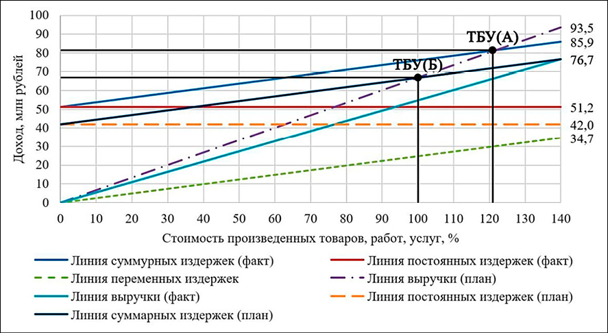 Маржинальный анализ проводится в четыре этапа [12,13]. На первом сформированы исходные данные на основе отчетности ООО «Би-Тавр» за 2024 год. К постоянным затратам на предприятии относятся управленческие расходы, амортизация основных средств и страховые взносы, а к переменным – коммунальные услуги, оплата труда персонала, а также закупка материалов. На втором этапе рассчитаны ключевые параметры CVP-анализа [14]: коэффициент маржинального дохода (54,7%), точка безубыточности (93,5 млн руб.), отрицательный запас финансовой прочности (-21,8%) и отрицательный операционный рычаг (-4,59 п.п.). Результаты CVP-анализа демонстрируют, что фактический объем выручки (76,7 млн руб.) на 21,8% ниже порогового значения (93,5 млн руб.), что свидетельствует об отсутствии запаса финансовой прочности.