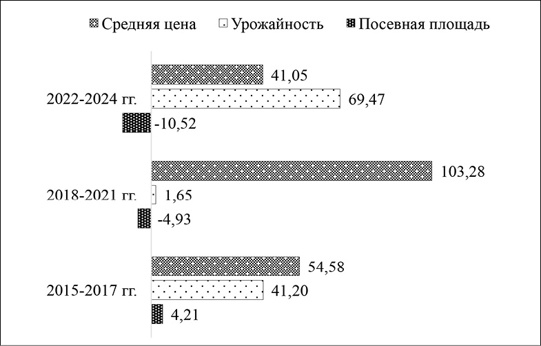 Результаты факторного анализа показывают, что прирост стоимостного объема валового сбора по периодам формировался за счет различного сочетания трех факторов (посевная площадь, урожайность, цена). При этом ключевое воздействие оказывали колебания урожайности и валового сбора, обусловленные природно-климатическими условиями, а также ценовая реакция рынка на изменения предложения (рисунок).