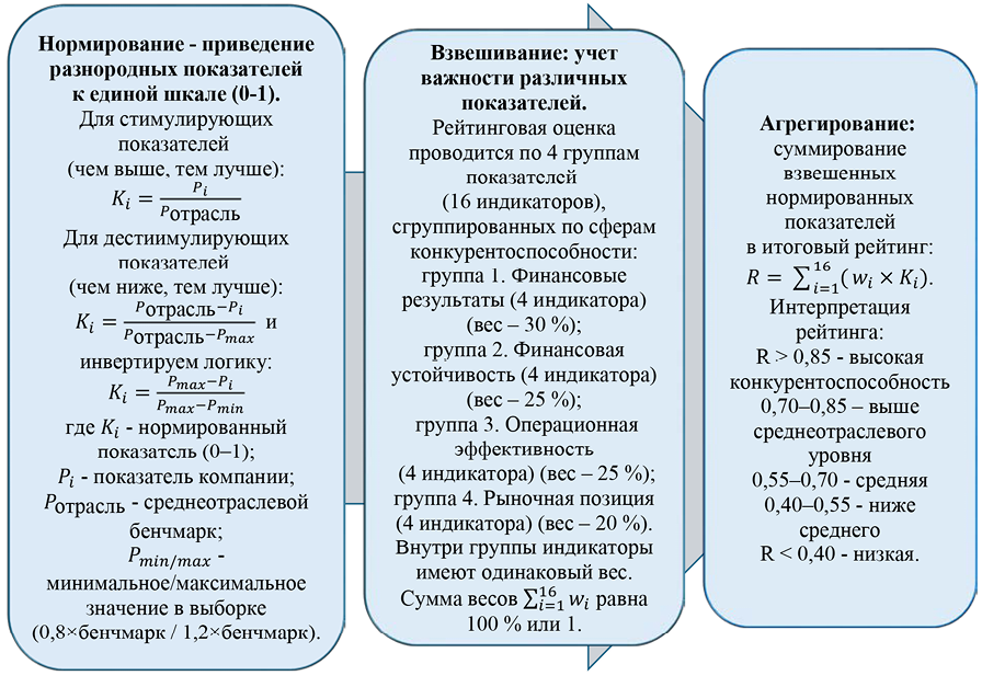 Для оценки конкурентоспособности регионального ритейла используем методику комплексной рейтинговой оценки. Данная методика, основанная на мультикритериальном сравнительном анализе с использованием нормирования показателей относительно среднеотраслевых бенчмарков для сектора розничной торговли [6] и последующей взвешенной агрегации, является стандартным подходом в экономическом анализе, однако выбор конкретных формул для этих этапов имеет решающее значение для достоверности и надежности конечного результата (рисунок).
