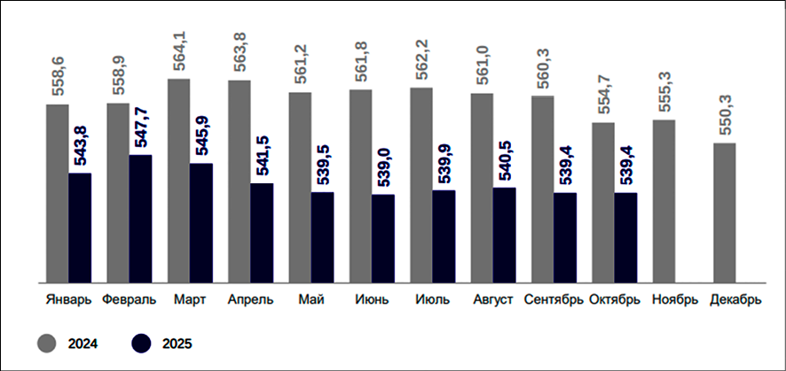 Рис. 2. Производство молока крупного рогатого скота 2024-2025 гг. Примечание: составлена авторами на основе источника [15]