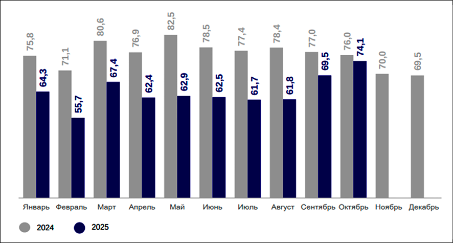 Анализ рисунка 3 показывает, что на протяжении 2024 г. показатели производства яиц превышали значения 2025 г. Современные технологии в птицеводстве, такие как автоматизация сбора яиц и уборки помещений, использование искусственного интеллекта для контроля качества продукции, а также инновационные методы кормления, позволяют нивелировать последствия сокращения поголовья и стабилизировать объемы производства.